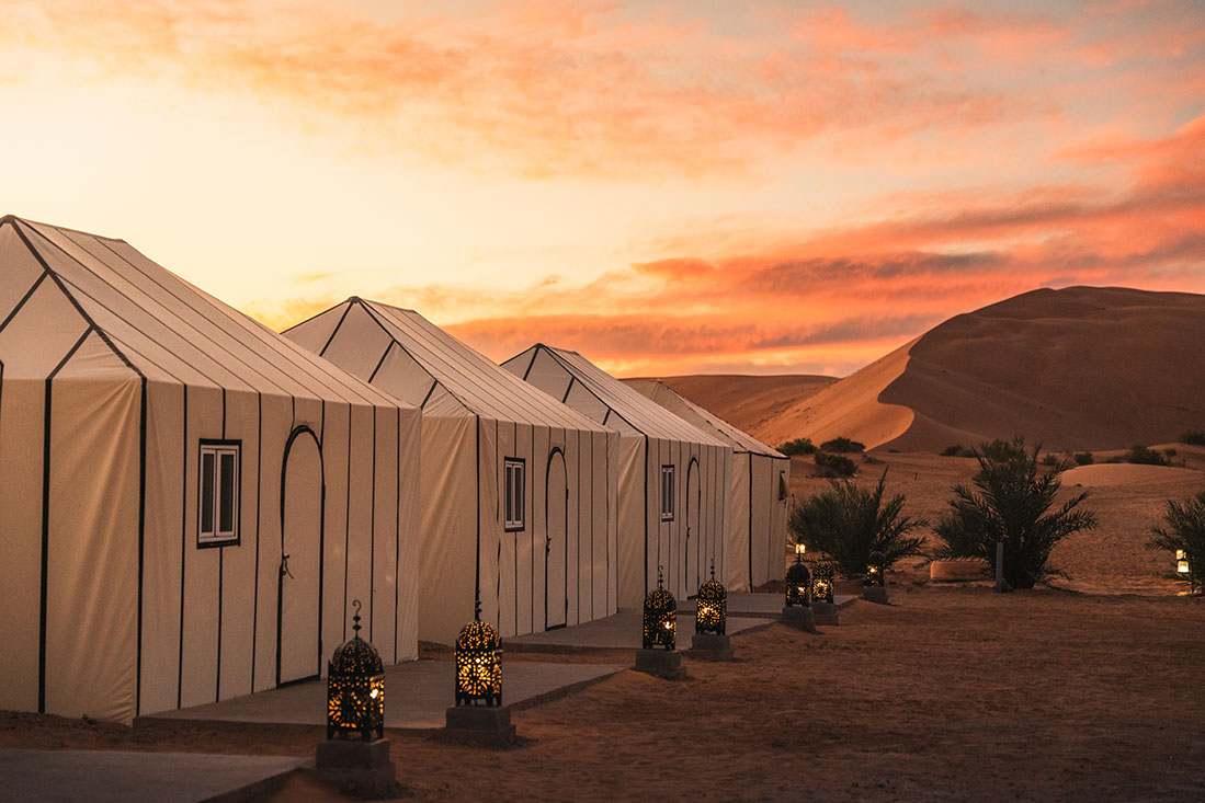 In this town, which gives its name to a portion of the Sahara Desert, we will leave the car to ride camels (replaceable by 4×4). In this way, we will take an excursion that will take us through a sea of ​​golden dunes of fine sand: Erg Chebbi. In the heart of this incomparable landscape is our Berber tent camp, where you will have dinner and rest at night. In the sky, thousands of shining stars will accompany your dreams.